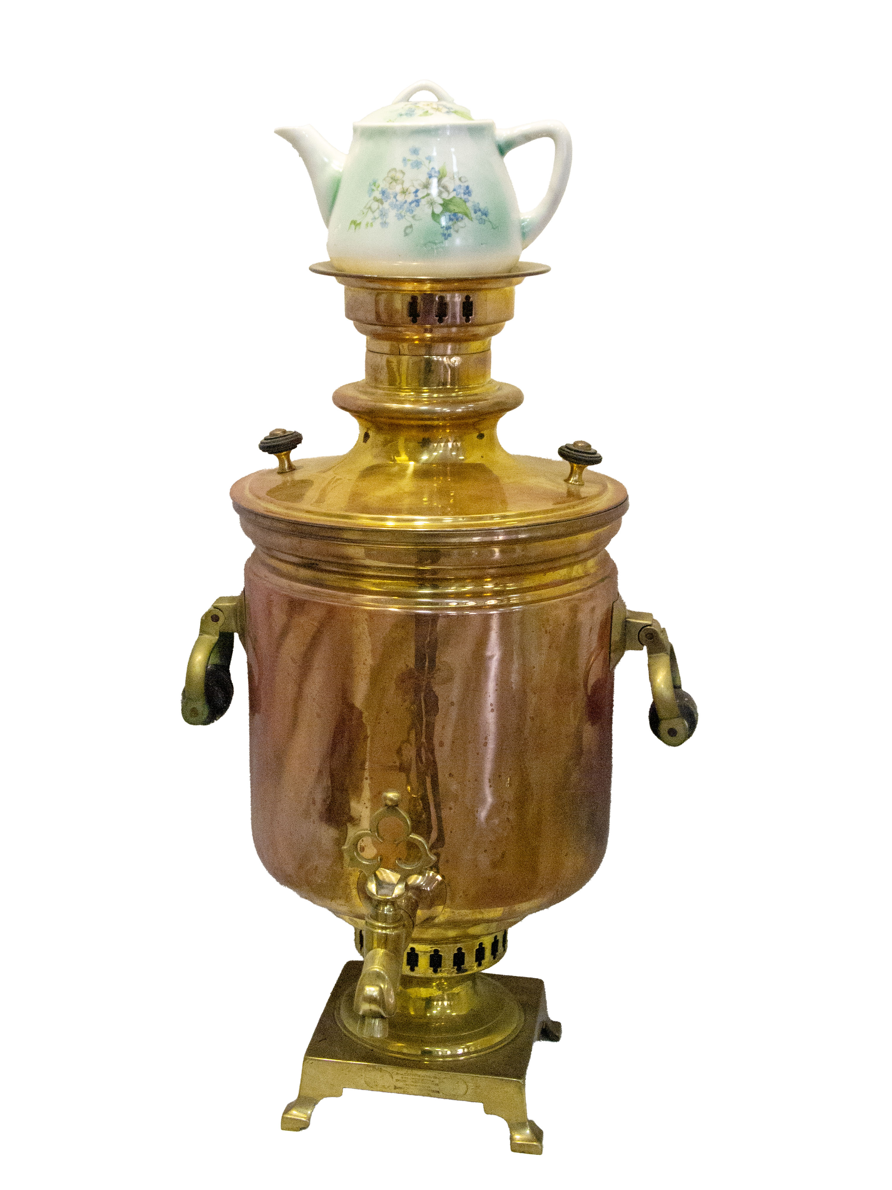 Самовар банкой "Товарищество Паровой Самоварной фабрики наследников Василия Степановича Баташева в Туле" и Чайник "Товарищество производства фарфоровых и фаянсовых изделий М.С. Кузнецова". Российская империя Кон. XIX – нач. XX вв.