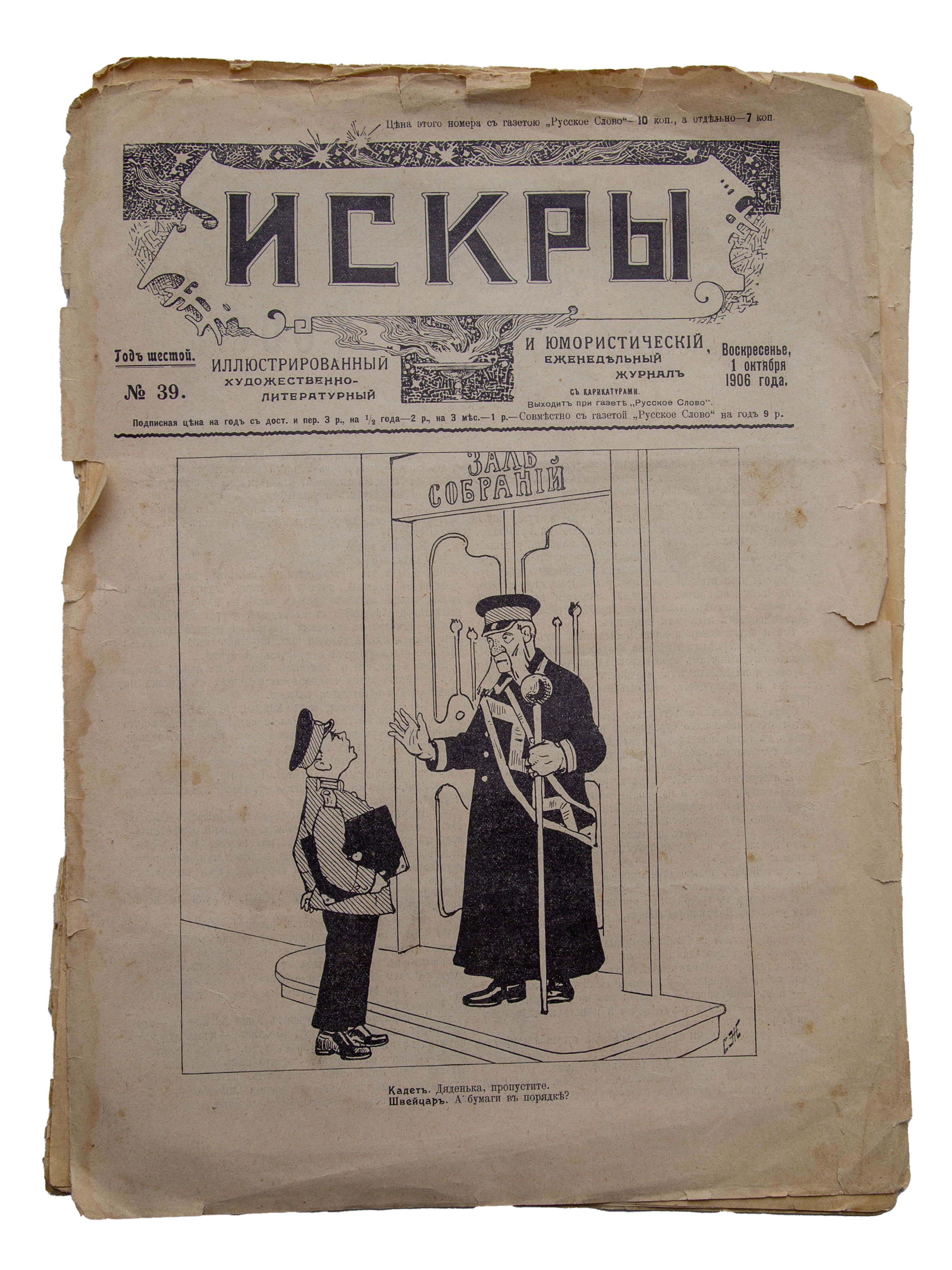 Иллюстративный и юмористический художественно-литературный еженедельный журнал "Искры", №39. Российская империя, Москва 1 октября 1906 г.