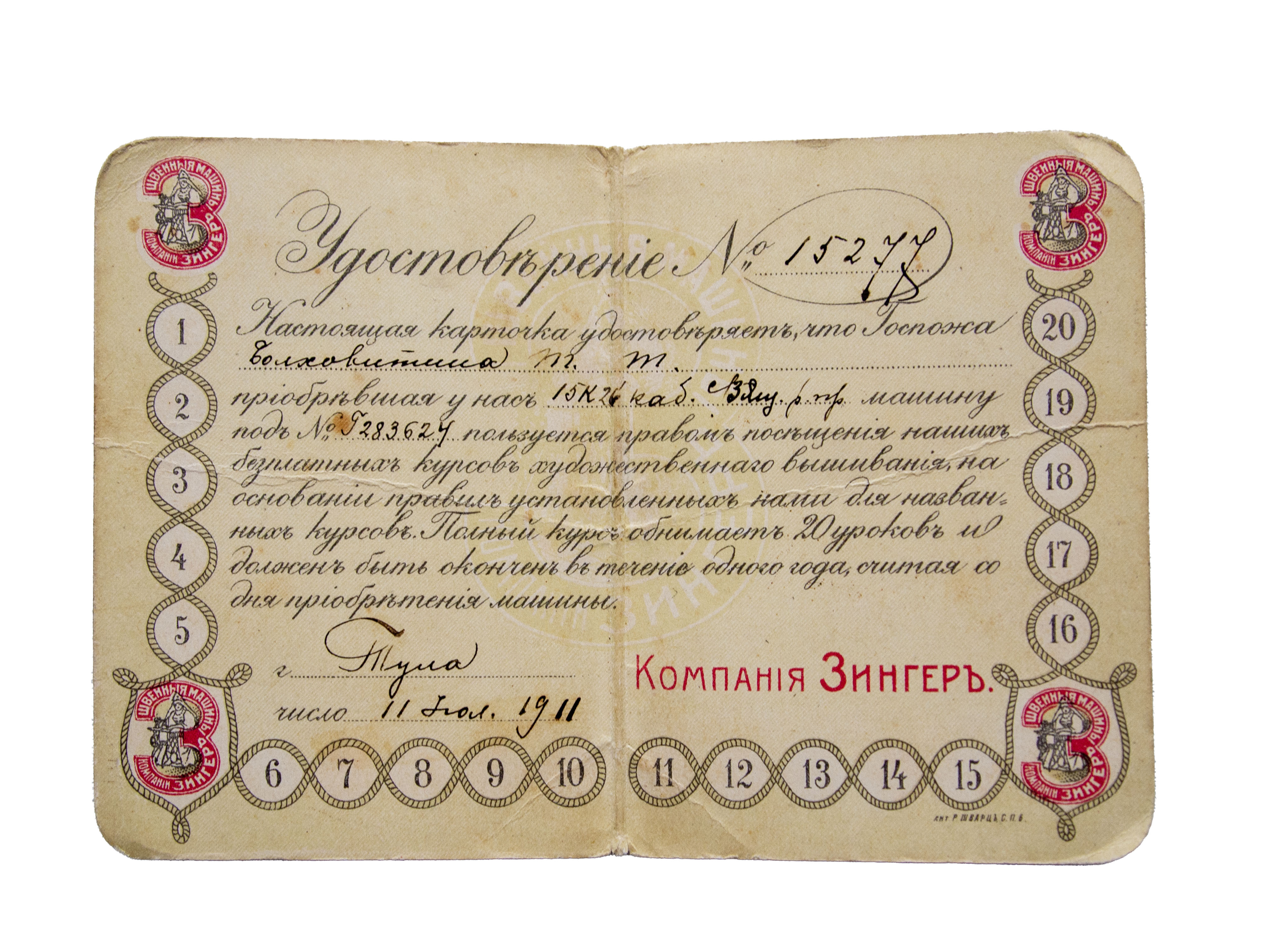 Удостоверение №15277 Болховитиной Т.Т. о праве на получение бесплатных курсов художественного вышивания компании Зингер. Российская империя, Тула 1911 г.